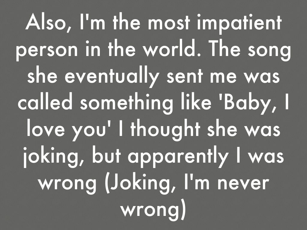 Also, I'm the most impatient person in the world. The song she eventually sent me was called something like 'Baby, I love you' I thought she was joking, but apparently I was wrong (Joking, I'm never wrong)