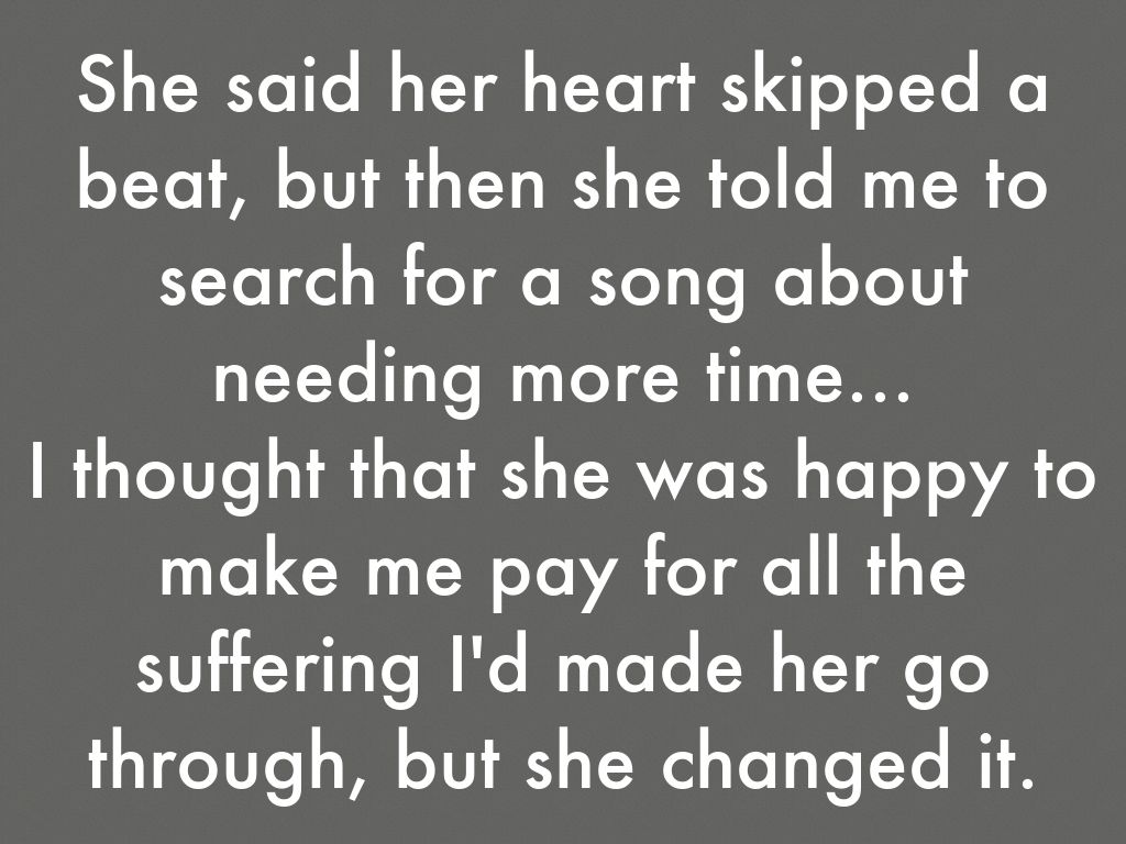 She said her heart skipped a beat, but then she told me to search for a song about needing more time...
