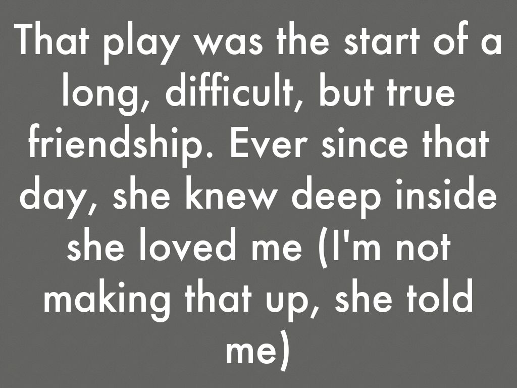 That play was the start of a long, difficult, but true friendship. Ever since that day, she knew deep inside she loved me (I'm not making that up, she told me)