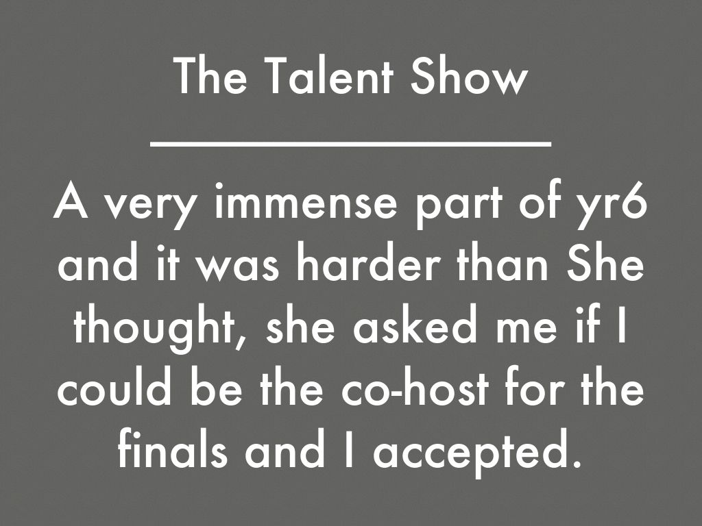 A very immense part of yr6 and it was harder than She thought, she asked me if I could be the co-host for the finals and I accepted.