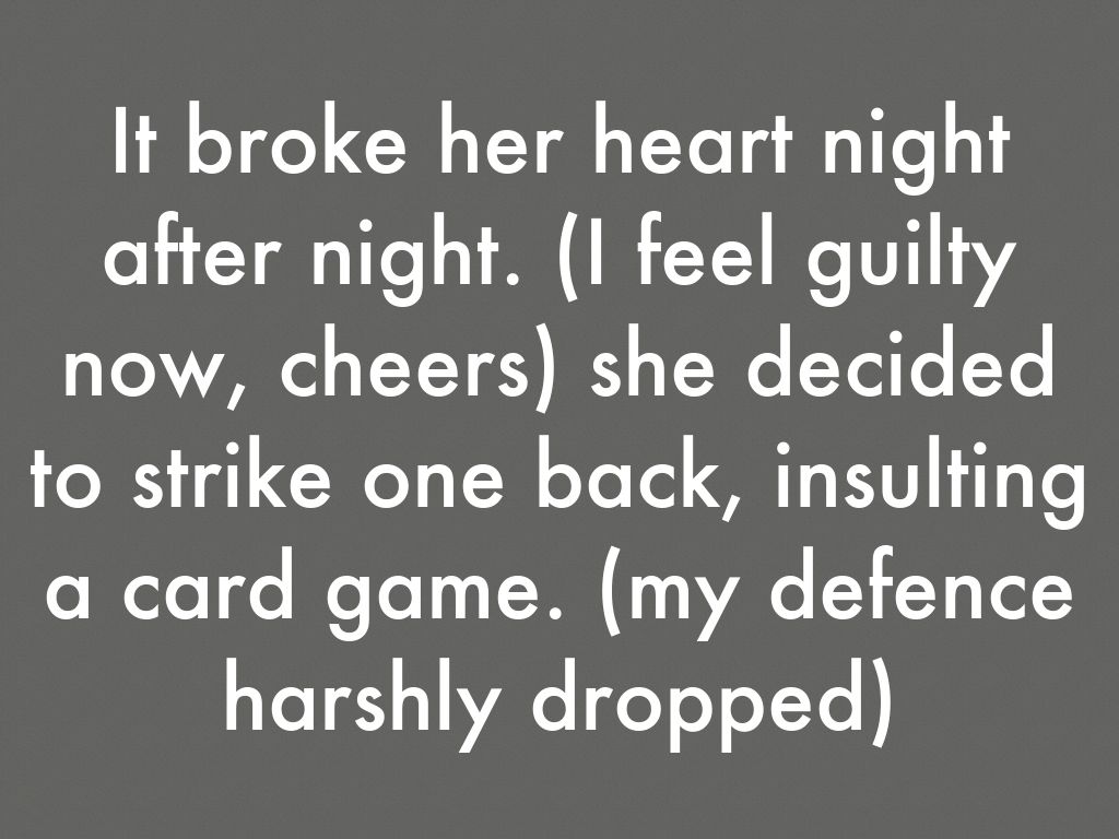 It broke her heart night after night. (I feel guilty now, cheers) she decided to strike one back, insulting a card game. (my defence harshly dropped)