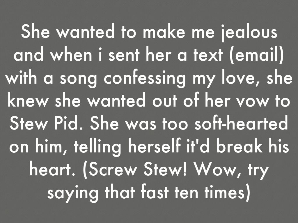 She wanted to make me jealous and when i sent her a text (email) with a song confessing my love, she knew she wanted out of her vow to Stew Pid. She was too soft-hearted on him, telling herself it'd break his heart. (Screw Stew! Wow, try saying that fast ten times)