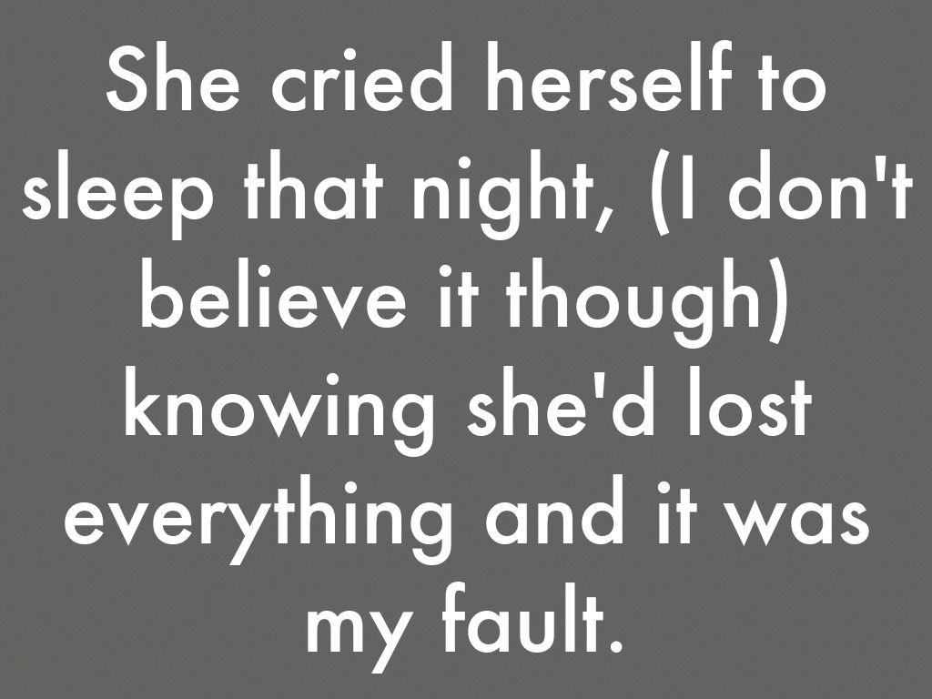 She cried herself to sleep that night, (I don't believe it though) knowing she'd lost everything and it was my fault.
