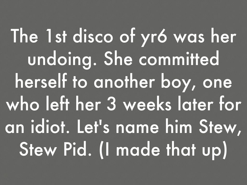The 1st disco of yr6 was her undoing. She committed herself to another boy, one who left her 3 weeks later for an idiot. Let's name him Stew, Stew Pid. (I made that up)