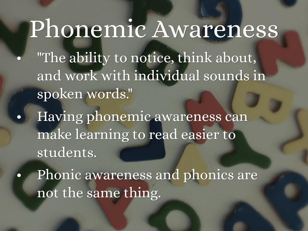 "The ability to notice, think about, and work with individual sounds in spoken words."