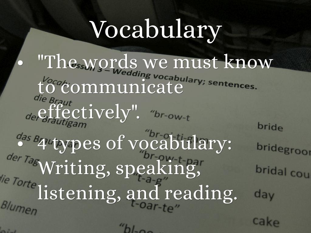 4 types of vocabulary: Writing, speaking, listening, and reading.