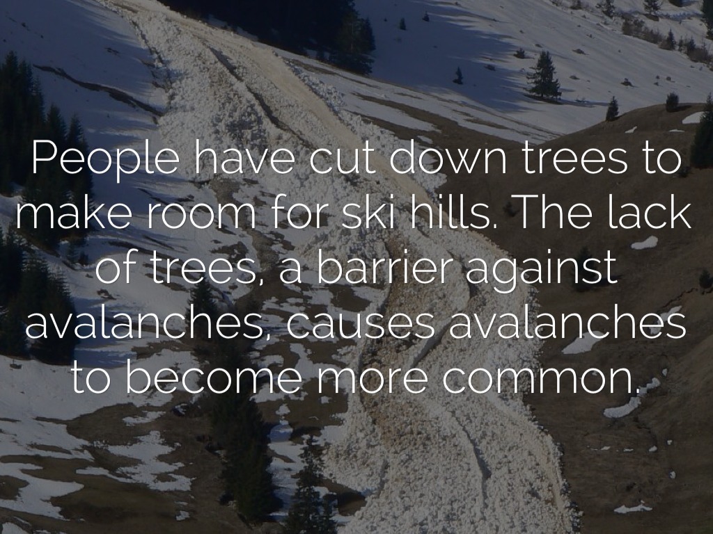 People have cut down trees to make room for ski hills. The lack of trees, a barrier against avalanches, causes avalanches to become more common.