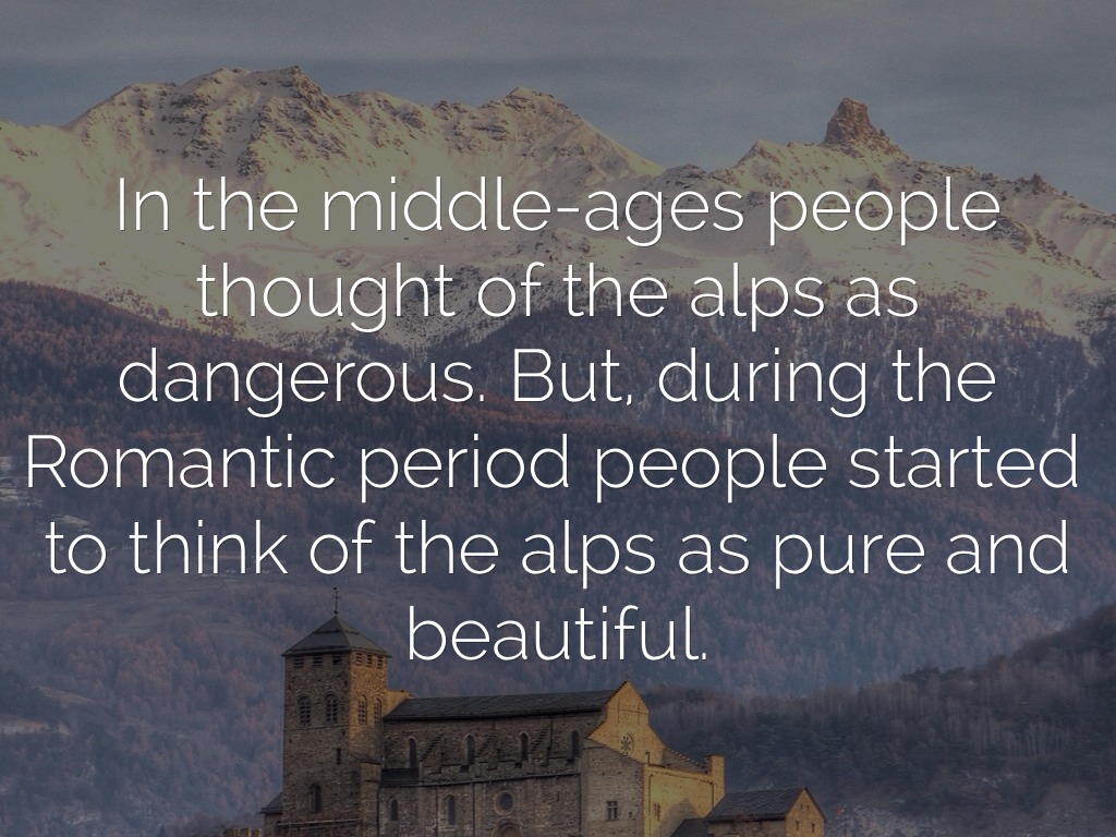 In the middle-ages people thought of the alps as dangerous. But, during the Romantic period people started to think of the alps as pure and beautiful.