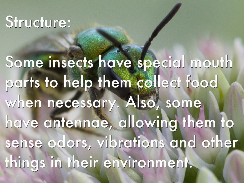 Some insects have special mouth parts to help them collect food when necessary. Also, some have antennae, allowing them to sense odors, vibrations and other things in their environment.