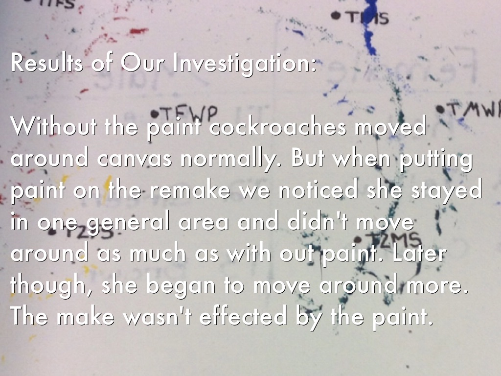 We learned that female cockroaches are more effected by paint then the males. We still don't know why the female was affected, but the male wasn't. Our hypothesis was partly true. With the male it was, but with the female we were incorrect. We could continue the investigation by putting the cockroaches on different surfaces with paint.