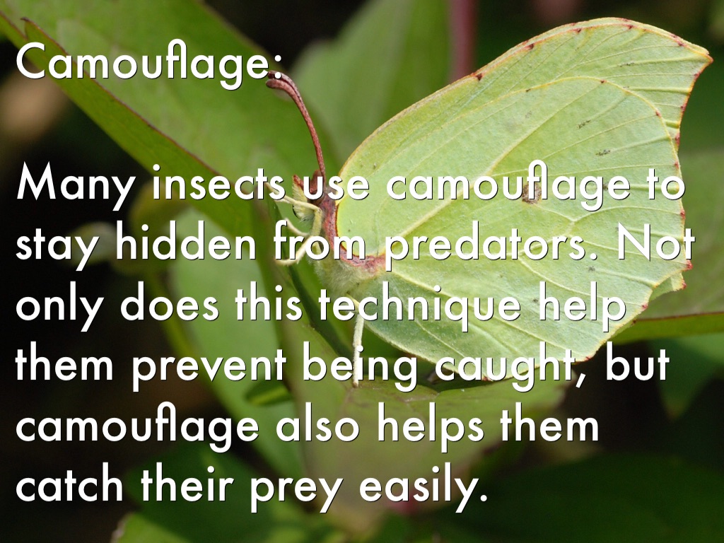 Many insects use camouflage to stay hidden from predators. Not only does this technique help them prevent being caught, but camouflage also helps them catch their prey easily.