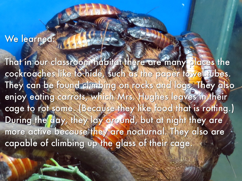 That in our classroom habitat there are many places the cockroaches like to hide, such as the paper towel tubes. They can be found climbing on rocks and logs. They also enjoy eating carrots, which Mrs. Hughes leaves in their cage to rot some. (Because they like food that is rotting.) During the day, they lay around, but at night they are more active because they are nocturnal. They also are capable of climbing up the glass of their cage.