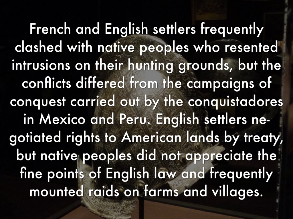French and English settlers frequently clashed with native peoples who resented intrusions on their hunting grounds, but the conflicts differed from the campaigns of conquest carried out by the conquistadores in Mexico and Peru. English settlers ne- gotiated rights to American lands by treaty, but native peoples did not appreciate the fine points of English law and frequently mounted raids on farms and villages.