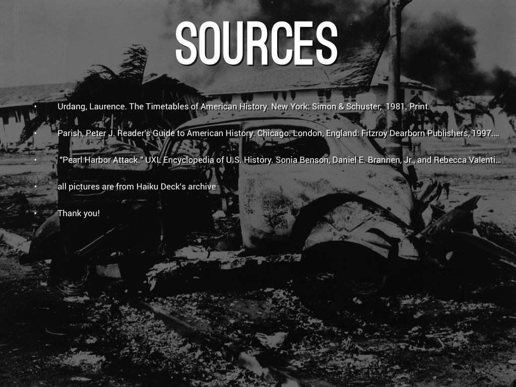 "Pearl Harbor Attack." UXL Encyclopedia of U.S. History. Sonia Benson, Daniel E. Brannen, Jr., and Rebecca Valentine. Vol. 6. Detroit: UXL, 2009. 1205-1207. Gale Virtual Reference Library. Web. 12 Oct. 2014.