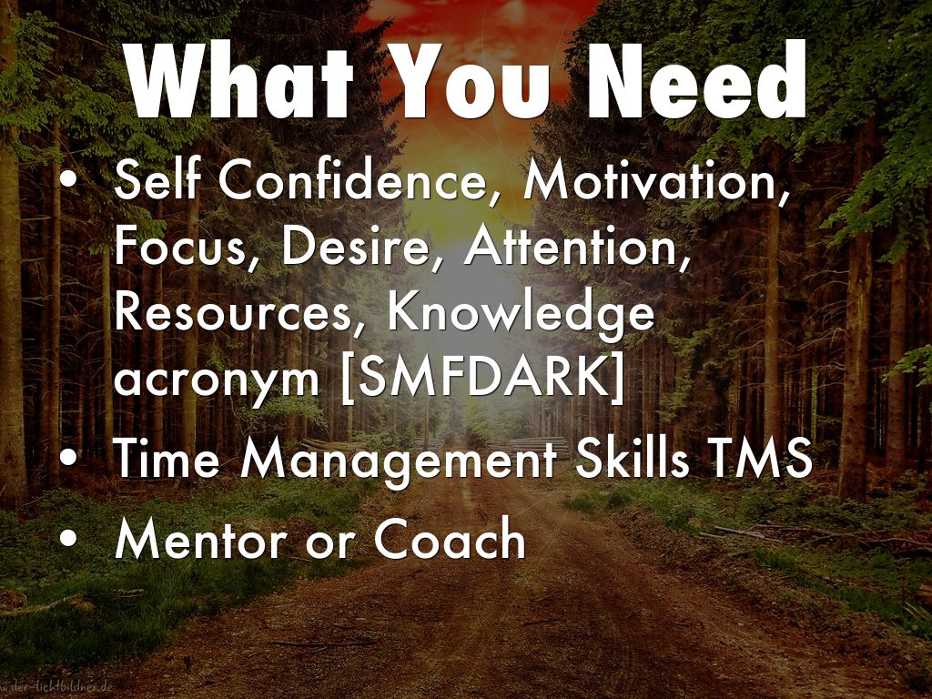 Self Confidence, Motivation, Focus, Desire, Attention, Resources, Knowledge acronym [SMFDARK]