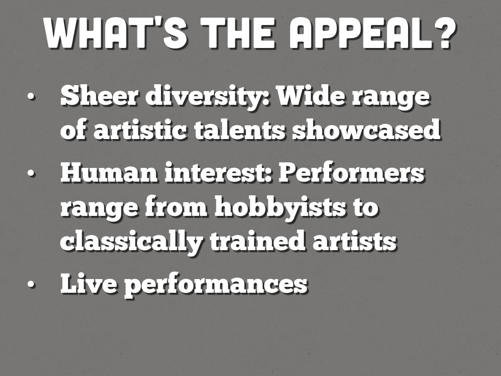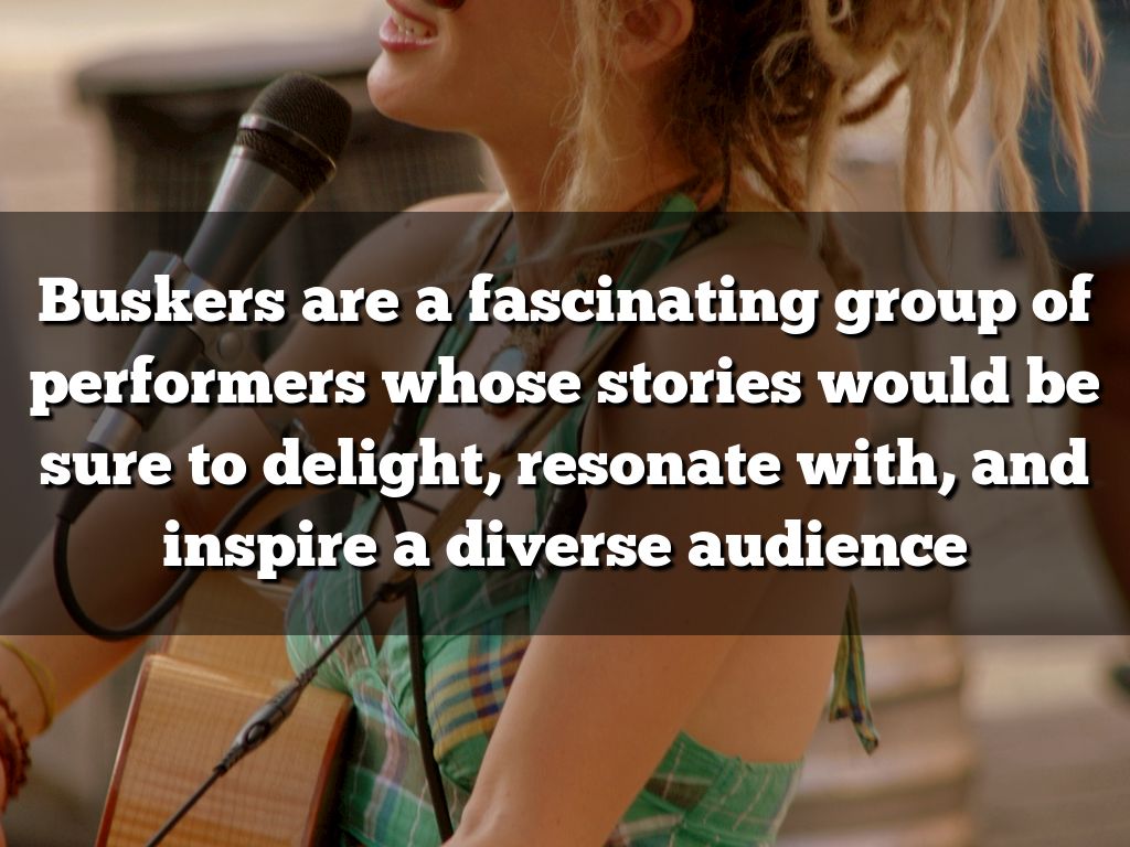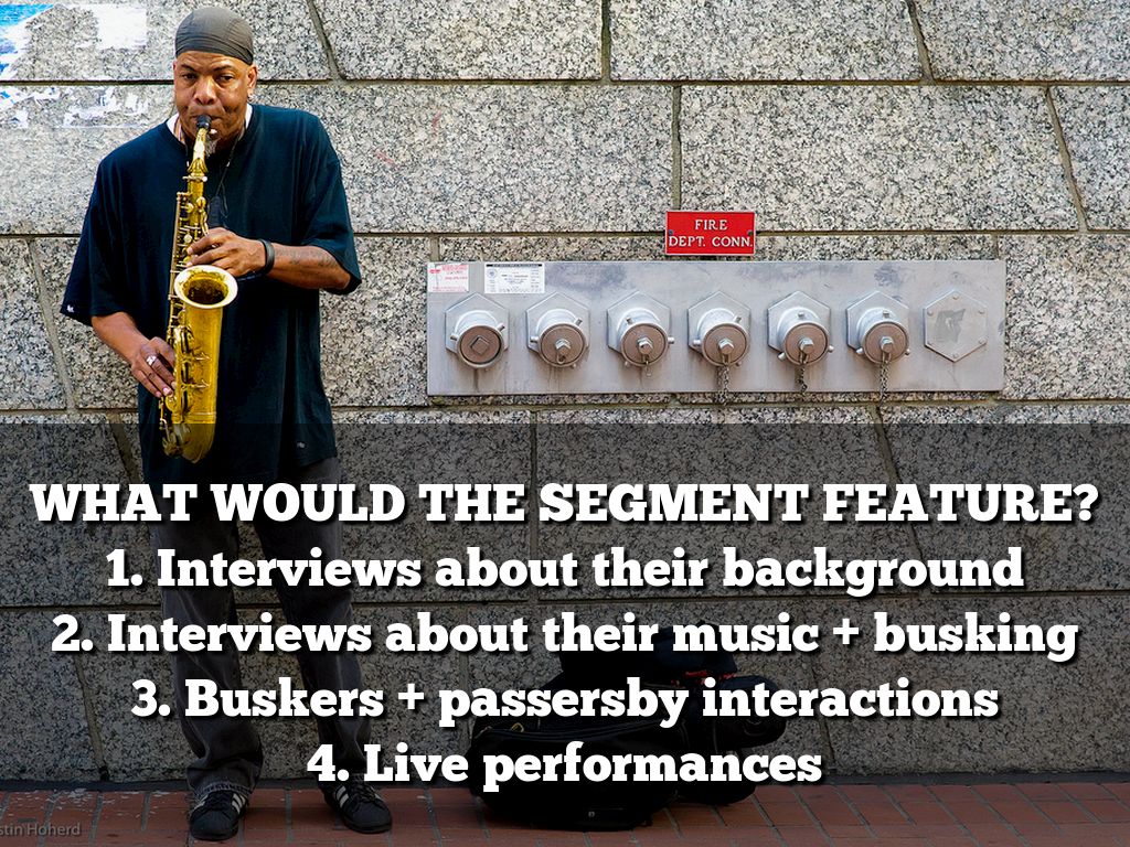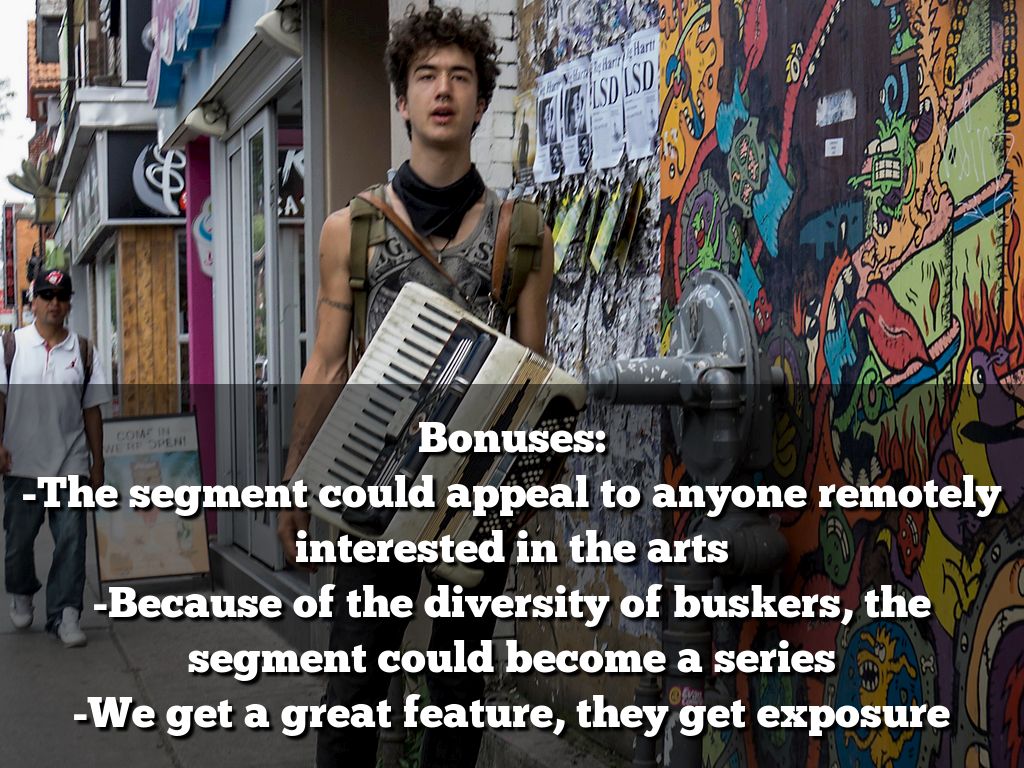 Bonuses: -The segment could appeal to anyone remotely interested in the arts -Because of the diversity of buskers, the segment could become a series -We get a great feature, they get exposure
