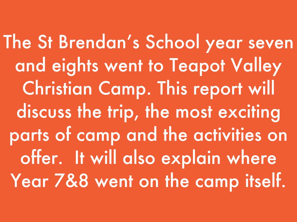 The St Brendan’s School year seven and eights went to Teapot Valley Christian Camp. This report will discuss the trip, the most exciting parts of camp and the activities on offer. It will also explain where Year 7&8 went on the camp itself.