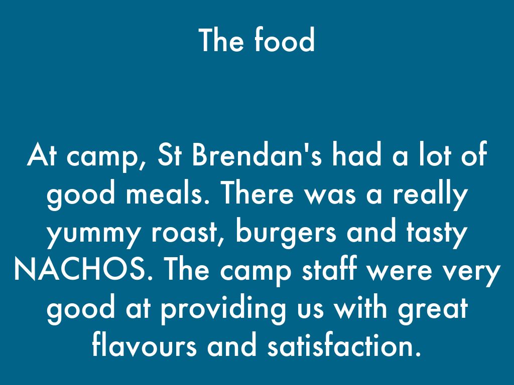 At camp, St Brendan's had a lot of good meals. There was a really yummy roast, burgers and tasty NACHOS. The camp staff were very good at providing us with great flavours and satisfaction.