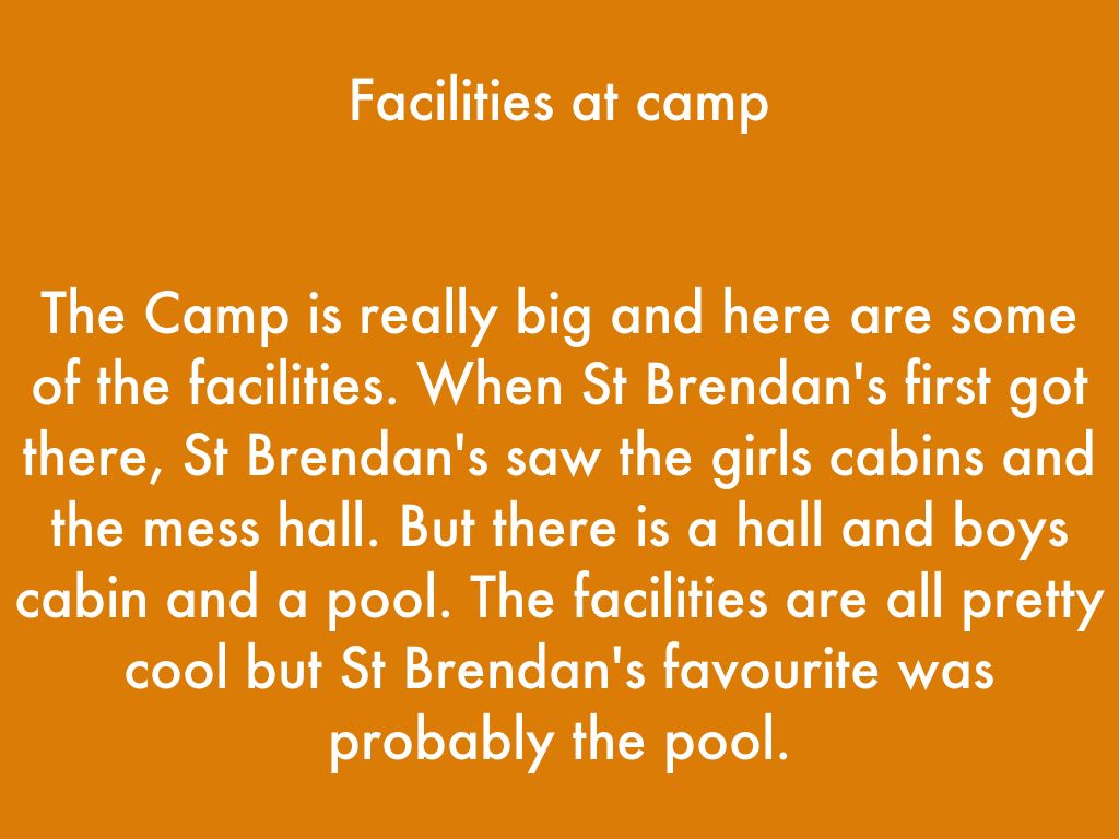 The Camp is really big and here are some of the facilities. When St Brendan's first got there, St Brendan's saw the girls cabins and the mess hall. But there is a hall and boys cabin and a pool. The facilities are all pretty cool but St Brendan's favourite was probably the pool.