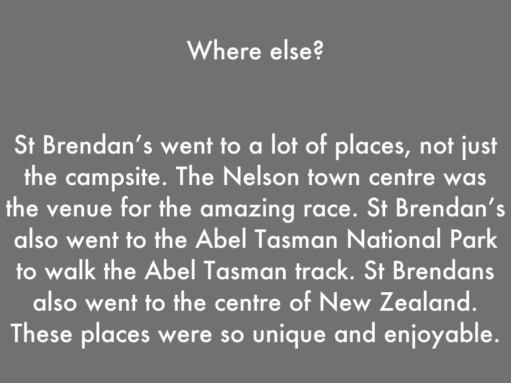St Brendan’s went to a lot of places, not just the campsite. The Nelson town centre was the venue for the amazing race. St Brendan’s also went to the Abel Tasman National Park to walk the Abel Tasman track. St Brendans also went to the centre of New Zealand. These places were so unique and enjoyable.
