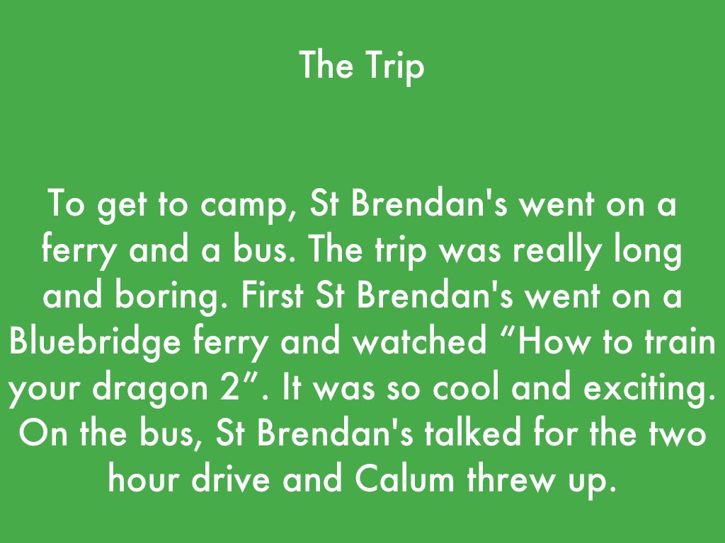 To get to camp, St Brendan's went on a ferry and a bus. The trip was really long and boring. First St Brendan's went on a Bluebridge ferry and watched “How to train your dragon 2”. It was so cool and exciting. On the bus, St Brendan's talked for the two hour drive and Calum threw up.