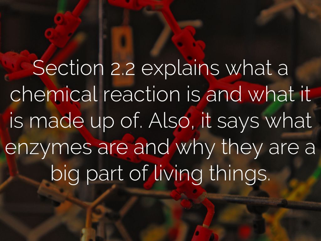 Section 2.2 explains what a chemical reaction is and what it is made up of. Also, it says what enzymes are and why they are a big part of living things.