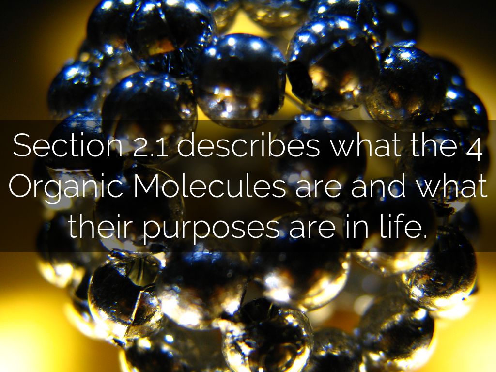 Section 2.1 describes what the 4 Organic Molecules are and what their purposes are in life.