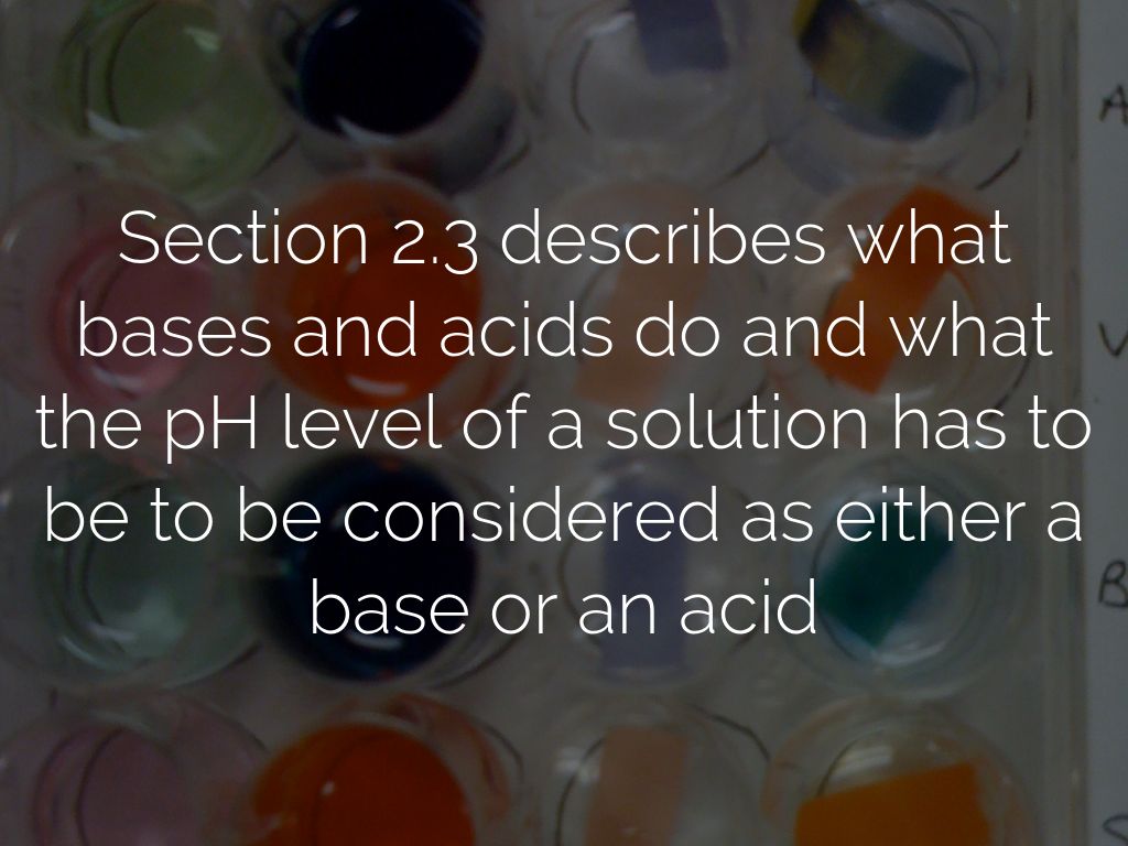 Section 2.3 describes what bases and acids do and what the pH level of a solution has to be to be considered as either a base or an acid
