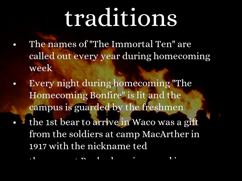 Every night during homecoming "The Homecoming Bonfire" is lit and the campus is guarded by the freshmen