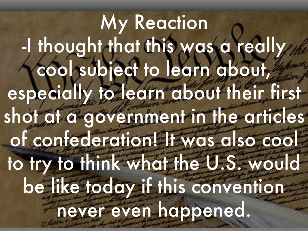 -I thought that this was a really cool subject to learn about, especially to learn about their first shot at a government in the articles of confederation! It was also cool to try to think what the U.S. would be like today if this convention never even happened.