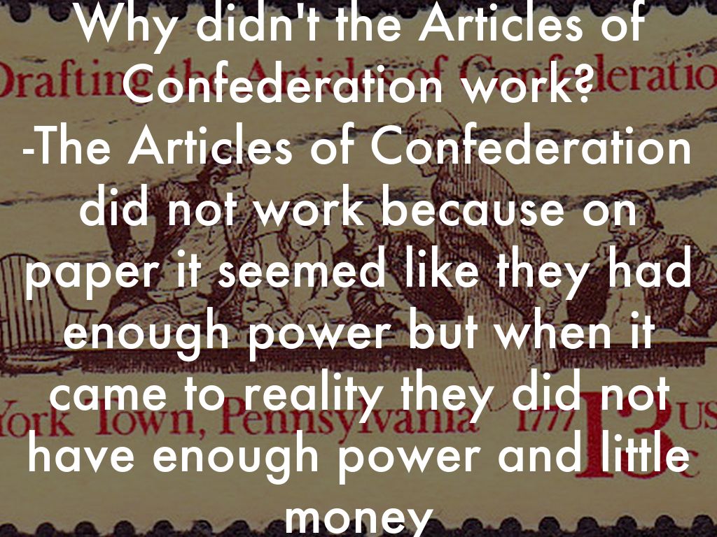 -The Articles of Confederation did not work because on paper it seemed like they had enough power but when it came to reality they did not have enough power and little money