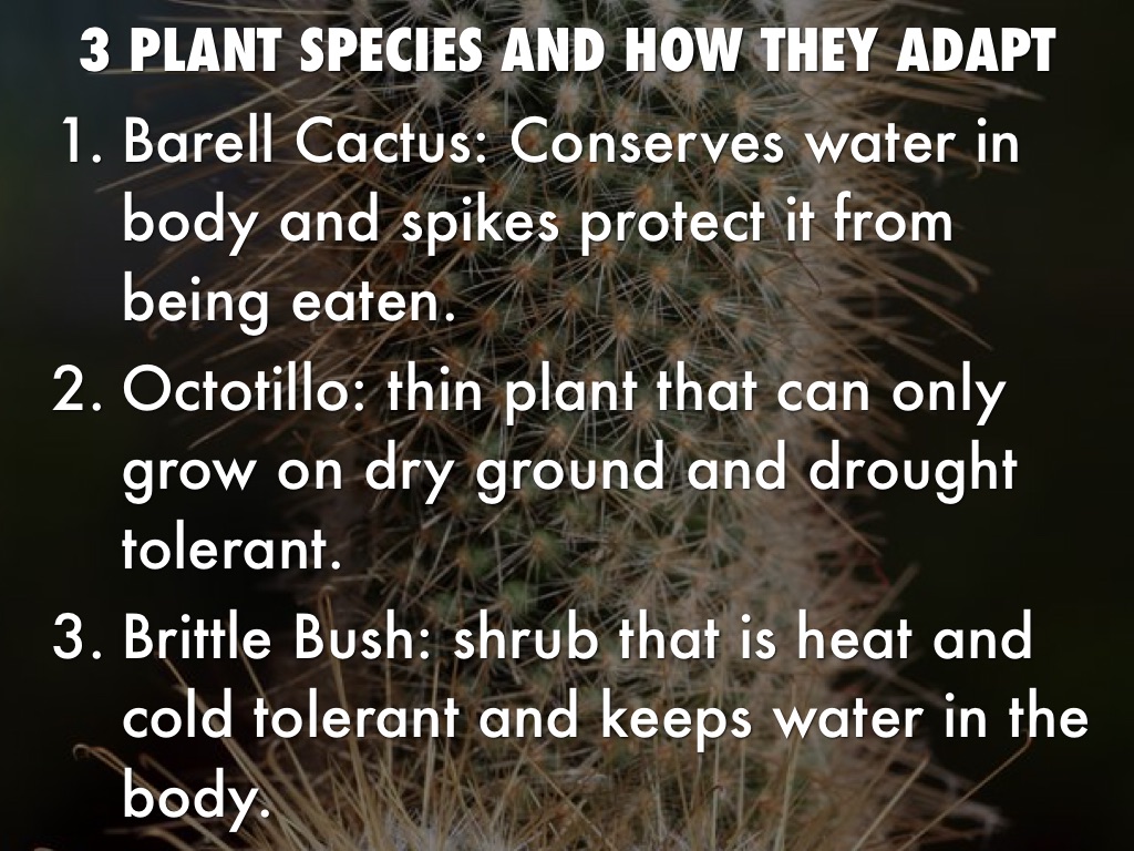 • Barell Cactus: Conserves water in body and spikes protect it from being eaten.