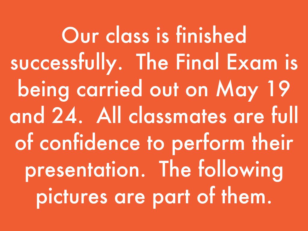 Our class is finished successfully. The Final Exam is being carried out on May 19 and 24. All classmates are full of confidence to perform their presentation. The following pictures are part of them.