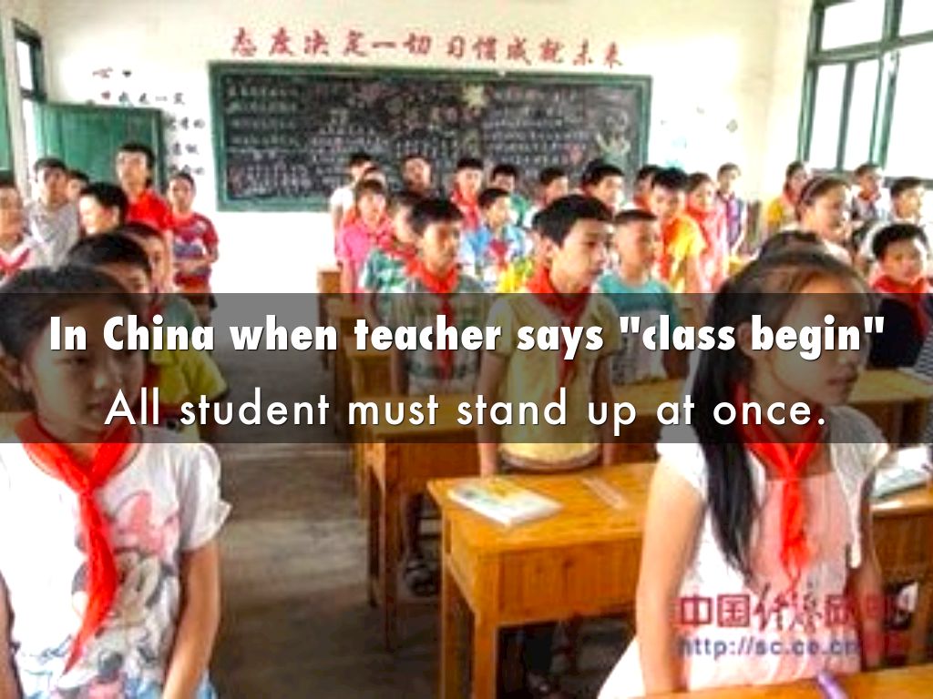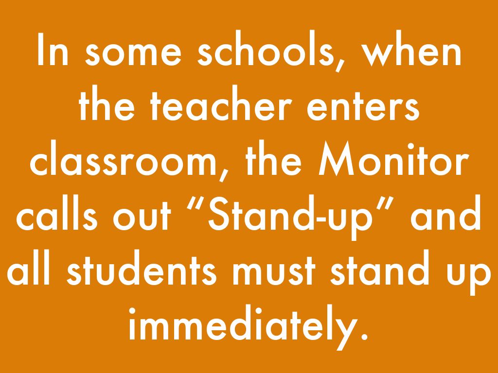 In some schools, when the teacher enters classroom, the Monitor calls out “Stand-up” and all students must stand up immediately.