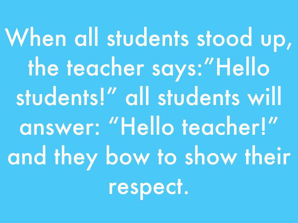 When all students stood up, the teacher says:”Hello students!” all students will answer: “Hello teacher!” and they bow to show their respect.
