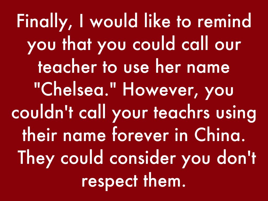 Finally, I would like to remind you that you could call our teacher to use her name "Chelsea." However, you couldn't call your teachrs using their name forever in China. They could consider you don't respect them.