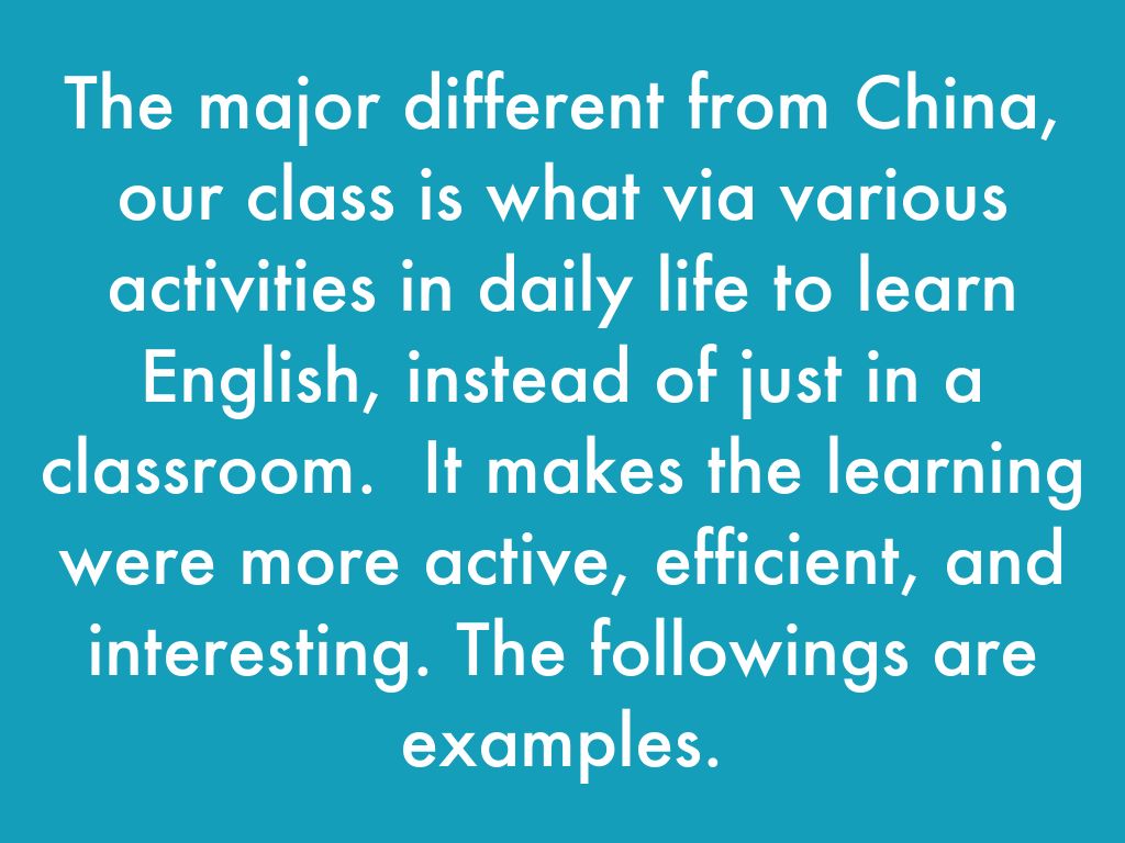 The major different from China, our class is what via various activities in daily life to learn English, instead of just in a classroom. It makes the learning were more active, efficient, and interesting. The followings are examples.