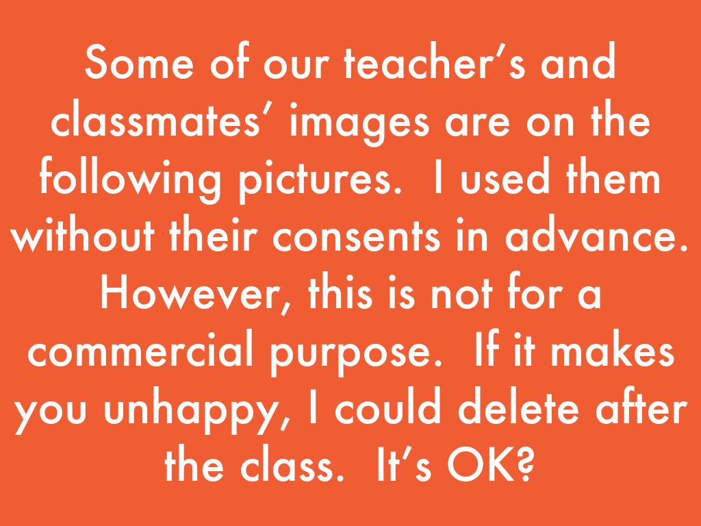 Some of our teacher’s and classmates’ images are on the following pictures. I used them without their consents in advance. However, this is not for a commercial purpose. If it makes you unhappy, I could delete after the class. It’s OK?