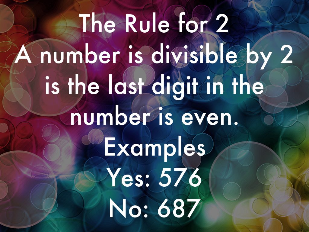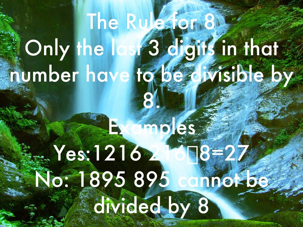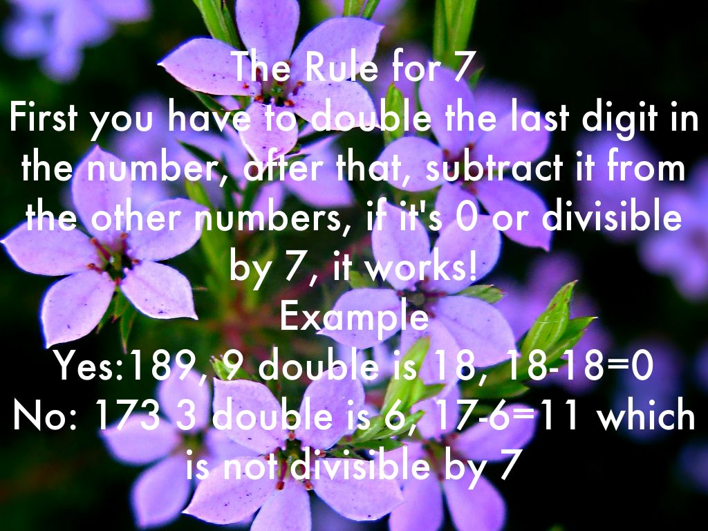 The Rule for 7 First you have to double the last digit in the number, after that, subtract it from the other numbers, if it's 0 or divisible by 7, it works! Example Yes:189, 9 double is 18, 18-18=0 No: 173 3 double is 6, 17-6=11 which is not divisible by 7