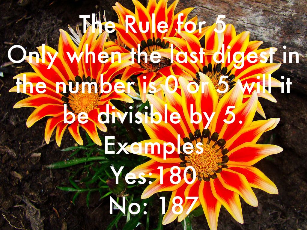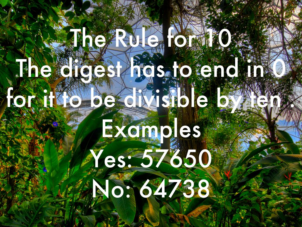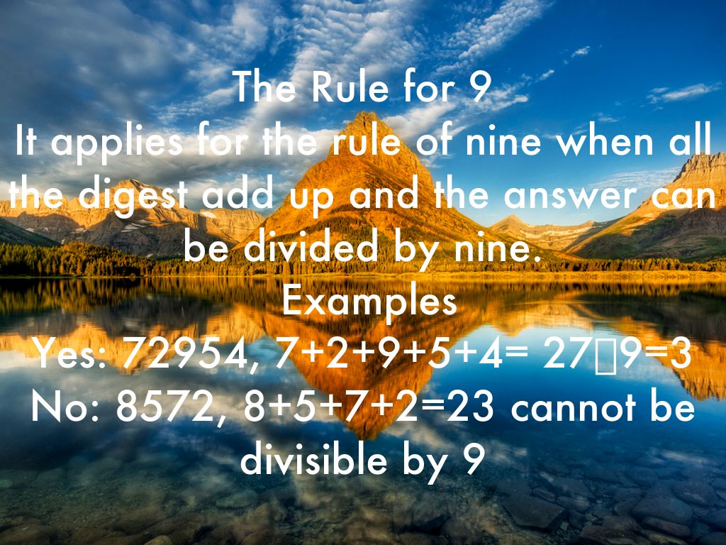The Rule for 9 It applies for the rule of nine when all the digest add up and the answer can be divided by nine. Examples Yes: 72954, 7+2+9+5+4= 27➗9=3 No: 8572, 8+5+7+2=23 cannot be divisible by 9