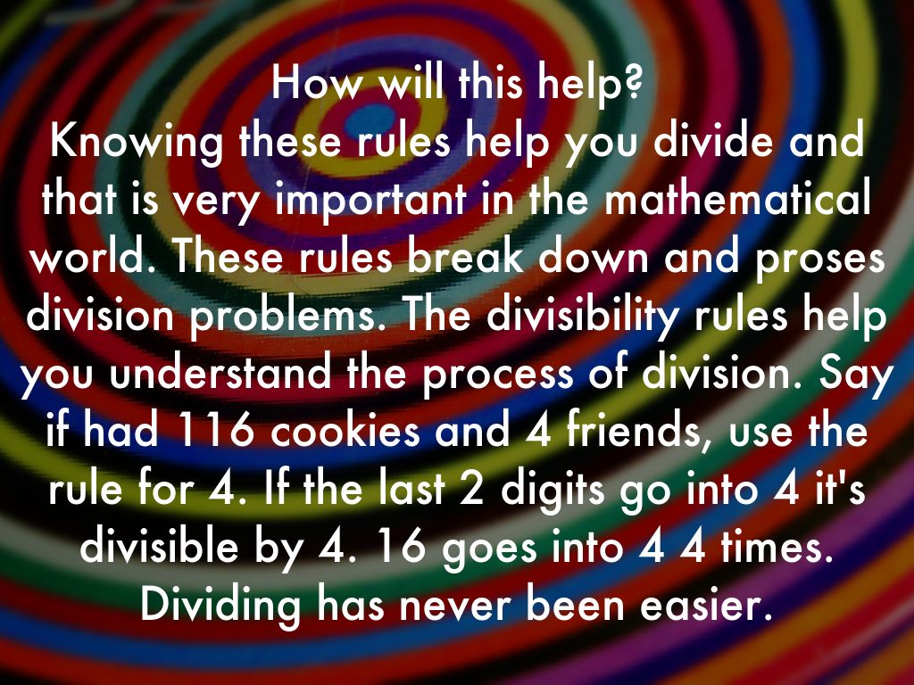 How will this help? Knowing these rules help you divide and that is very important in the mathematical world. These rules break down and proses division problems. The divisibility rules help you understand the process of division. Say if had 116 cookies and 4 friends, use the rule for 4. If the last 2 digits go into 4 it's divisible by 4. 16 goes into 4 4 times. Dividing has never been easier.