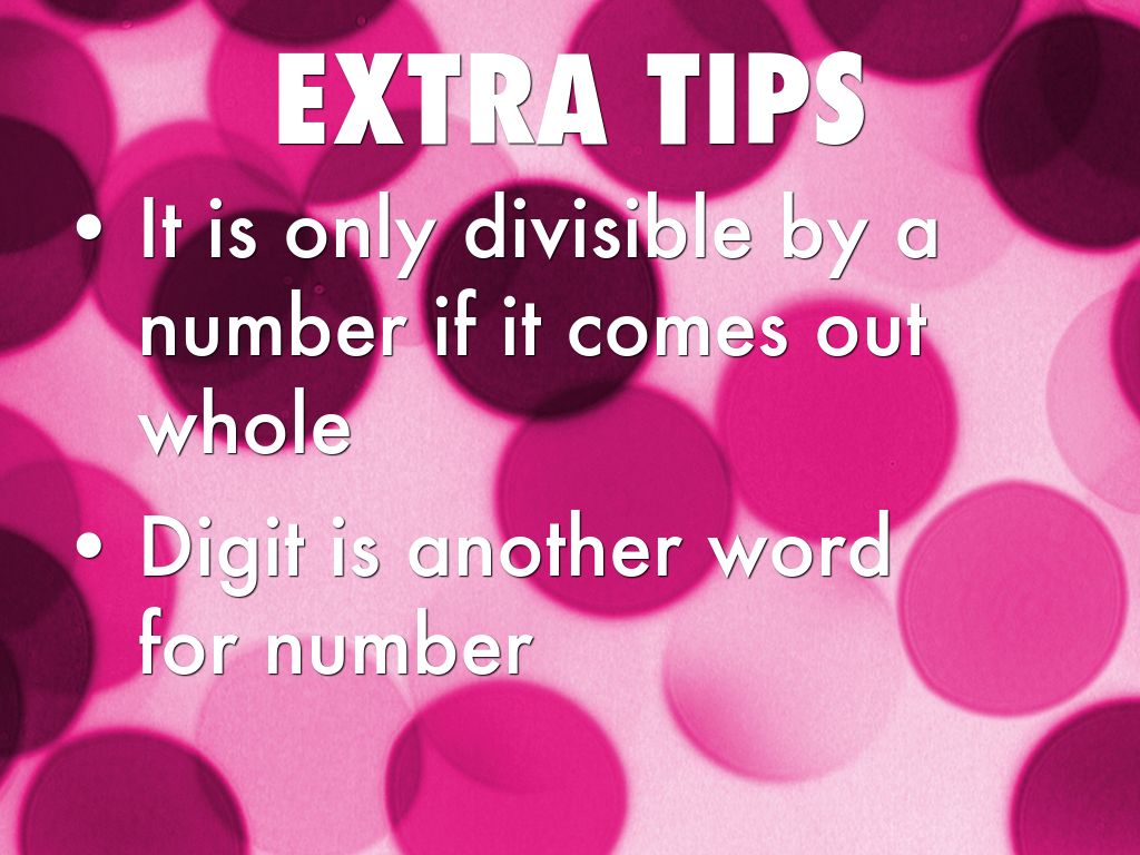 The Rule for 3 When you add all of the digits in the number and it is divisible by 3 Yes: 7437, 7+4+3+7=21➗3=7 No: 5476, 5+4+7+6=22 cannot be divisible by 3.