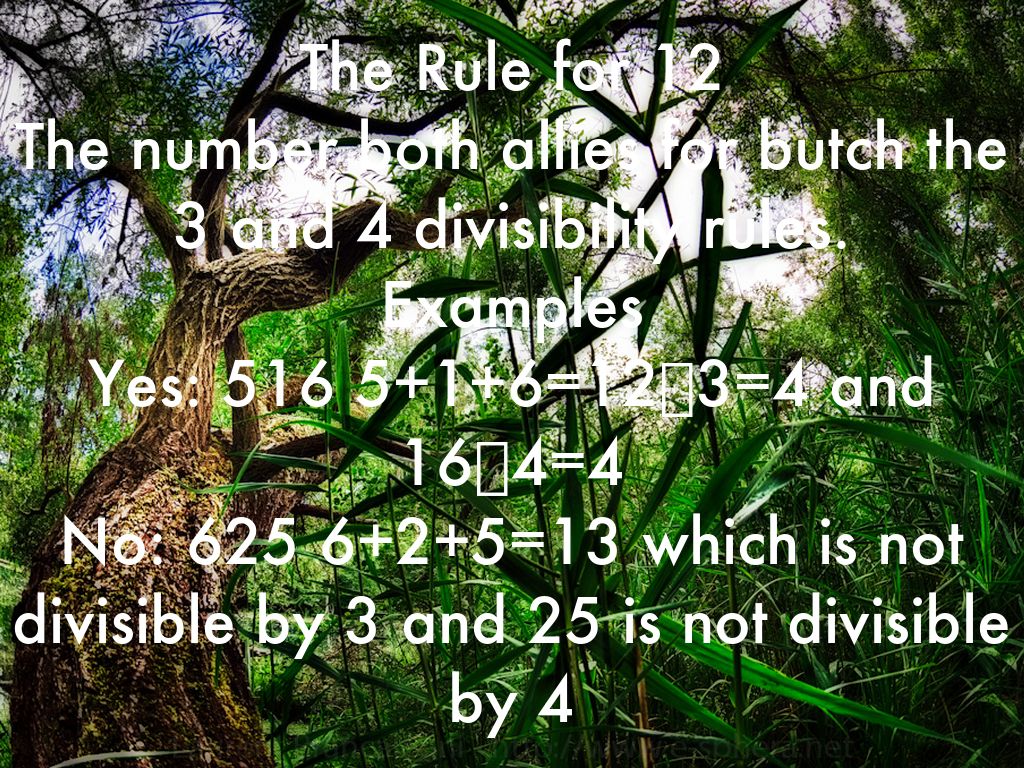The Rule for 12 The number both allies for butch the 3 and 4 divisibility rules. Examples Yes: 516 5+1+6=12➗3=4 and 16➗4=4 No: 625 6+2+5=13 which is not divisible by 3 and 25 is not divisible by 4