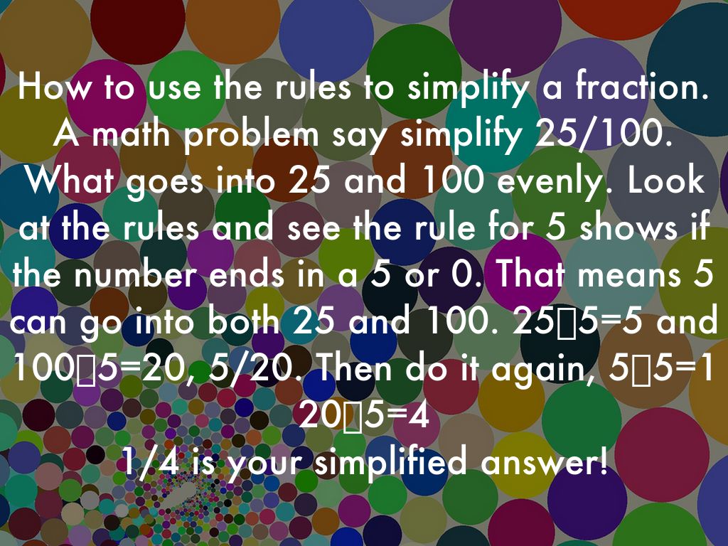 How to use the rules to simplify a fraction. A math problem say simplify 25/100. What goes into 25 and 100 evenly. Look at the rules and see the rule for 5 shows if the number ends in a 5 or 0. That means 5 can go into both 25 and 100. 25➗5=5 and 100➗5=20, 5/20. Then do it again, 5➗5=1 20➗5=4 1/4 is your simplified answer!