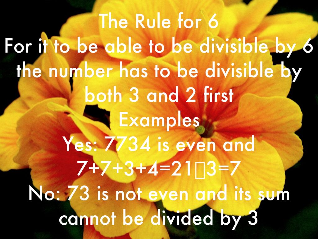The Rule for 6 For it to be able to be divisible by 6 the number has to be divisible by both 3 and 2 first Examples Yes: 7734 is even and 7+7+3+4=21➗3=7 No: 73 is not even and its sum cannot be divided by 3