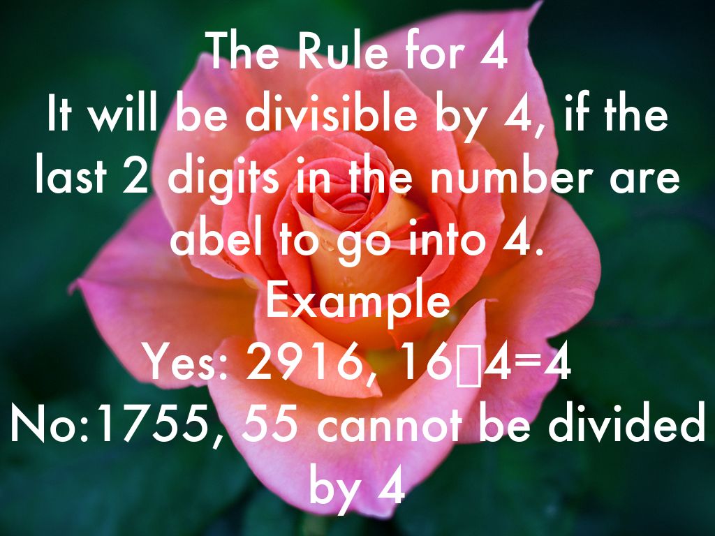 The Rule for 4 It will be divisible by 4, if the last 2 digits in the number are abel to go into 4. Example Yes: 2916, 16➗4=4 No:1755, 55 cannot be divided by 4