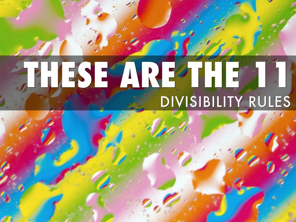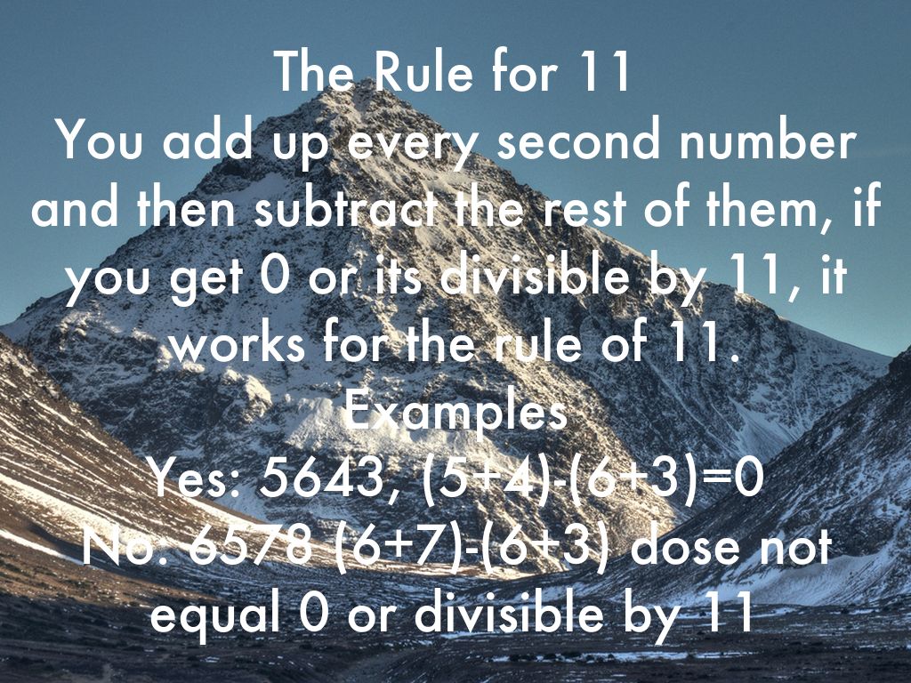 The Rule for 11 You add up every second number and then subtract the rest of them, if you get 0 or its divisible by 11, it works for the rule of 11. Examples Yes: 5643, (5+4)-(6+3)=0 No: 6578 (6+7)-(6+3) dose not equal 0 or divisible by 11