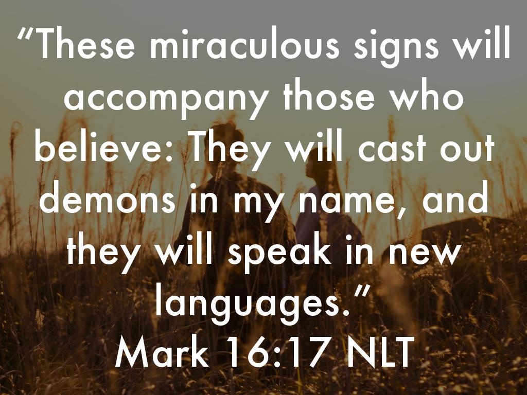 “These miraculous signs will accompany those who believe: They will cast out demons in my name, and they will speak in new languages.” Mark 16:17 NLT