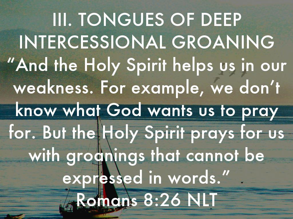 III. TONGUES OF DEEP INTERCESSIONAL GROANING “And the Holy Spirit helps us in our weakness. For example, we don’t know what God wants us to pray for. But the Holy Spirit prays for us with groanings that cannot be expressed in words.” Romans 8:26 NLT