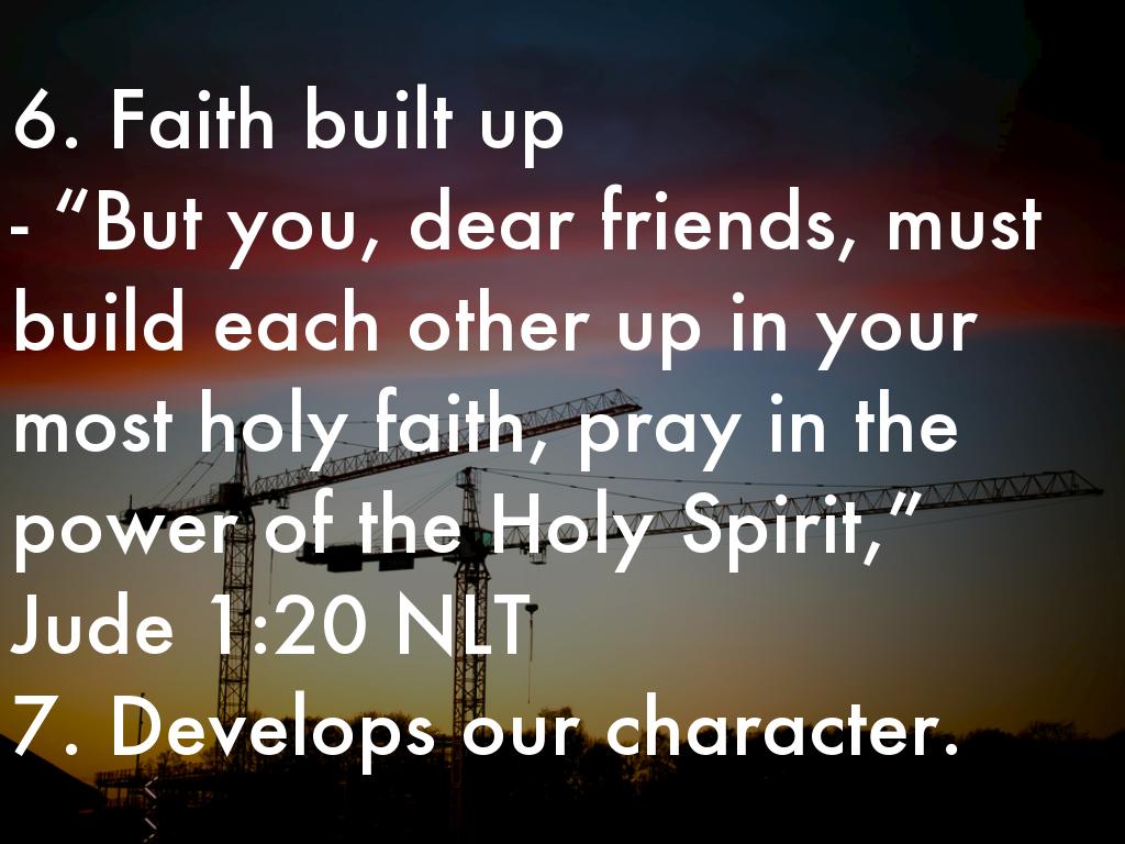 6. Faith built up - “But you, dear friends, must build each other up in your most holy faith, pray in the power of the Holy Spirit,” Jude 1:20 NLT 7. Develops our character.